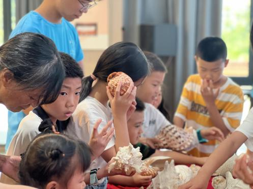 参观“与红树林对话”海洋生物标本展。红树林不仅是防风消浪的“海岸卫士”、净化海水的“过滤器”,还是维持生物多样性的“鱼虾乐园”“鸟类天堂”,实践团指导老师艾为明老师向小朋友们展示鹦鹉螺、中华鲟、唐冠螺、万宝螺等海洋生物标本。在艾老师的一一讲解下,小朋友们纷纷拿起一件件陈列的标本欣赏端详,放在耳边聆听海浪的回响,进一步认识到了海洋生物多样性。