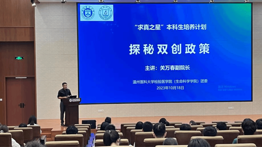 团委邀请副院长关万春于10月19日下午在医药科研大楼报告厅举办“探秘双创政策”的主题讲座。学院教师和各科研团队指导老师以及各年级学生代表到现场学习交流,讲座同时线上直播。