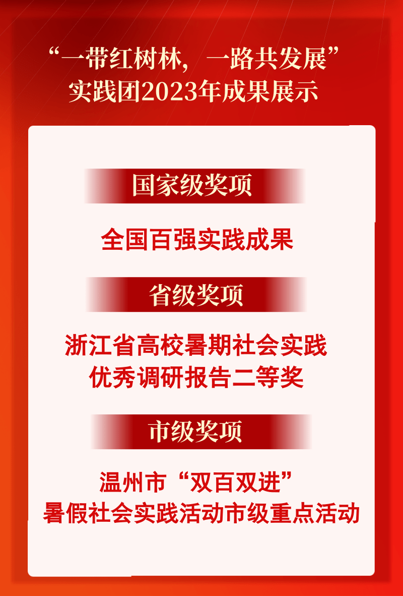 “一带红树林,一路共发展”实践团深入温州乐清、洞头、龙港、苍南和泰国的红树林保护区,开展科普宣讲和实地保护工作,引导居民树立同一健康理念,增强红树林保护能力。2023年第九届全国大学生暑期实践展示活动结果公布,该团队项目获评“全国百强实践成果”;在2023年浙江省高校暑期社会实践优秀调研报告评选决赛中,经书面评审、现场答辩等环节,该团队项目从606件作品中脱颖而出,斩获省级二等奖;在温州市评比中,荣获“双百双进”暑期社会实践活动市级重点团队称号等荣誉。