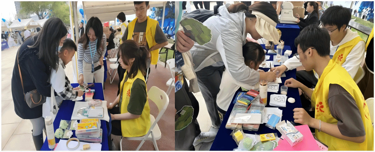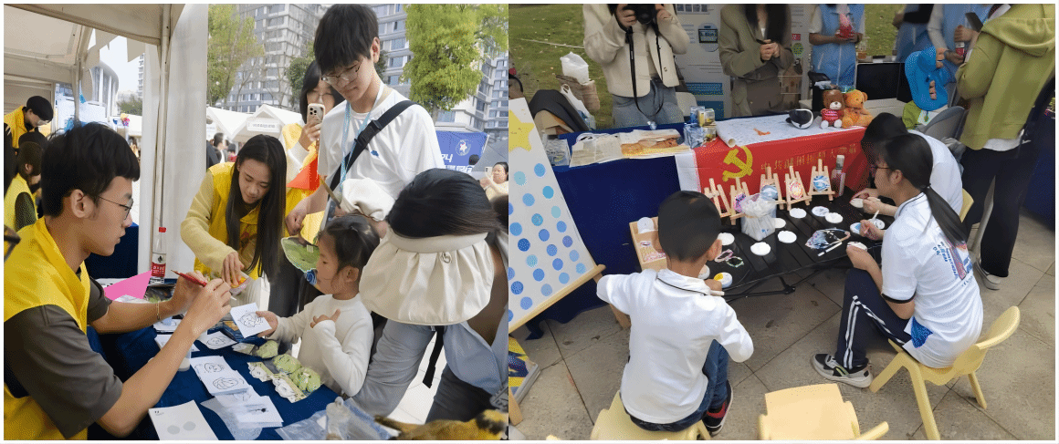 阳光志愿者带孤独症儿童“星宝”体验现场多种形式的活动,同时,还根据“星宝”的特性专门设立了“益耳密码”和“红树林守护”志愿服务项目的宣传和体验摊位。
