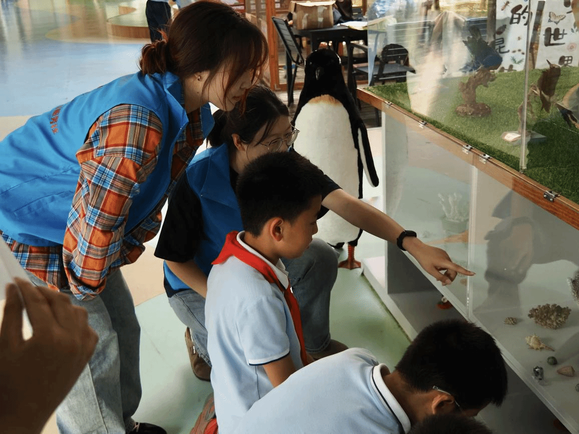(生命科学学院)志愿者师生向小学生介绍生物标本,引起了小学生们浓厚的探索兴趣。