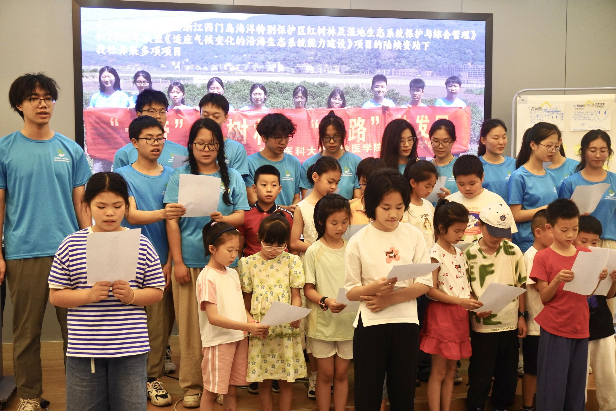 “时光如潮水,我们像树一样,沿着岸根系,牵着手吧”,悠扬的旋律在室内回荡,小营员和实践团成员们共同歌唱《向海而生》,在歌声中共同许下守护海洋之约。