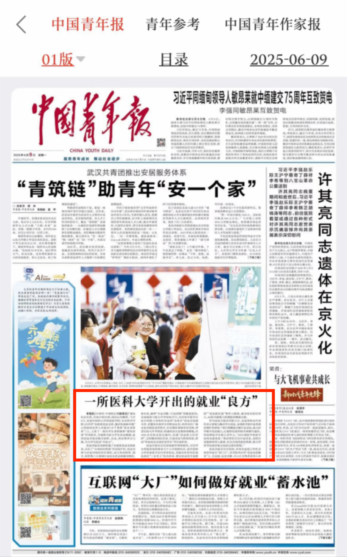 《中国青年报》2025年6月9日头版刊发《一所医科大学开出的就业“良方”》,报道我院为破解当前大学生就业难题,联合医院、企业、校友等多方力量,为大学生就业“开良方”的大思政就业育人共促会。