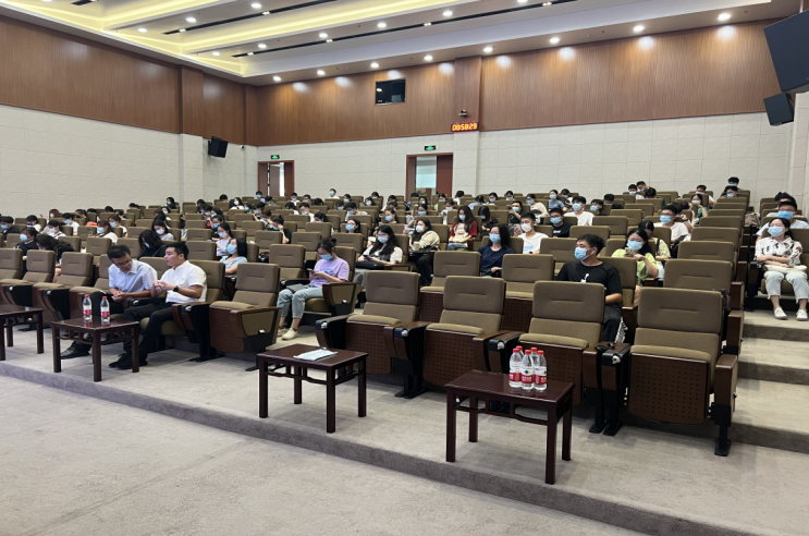 于生物医药科研楼学术报告厅开展研究生始业教育。学院党委副书记陈贤新、副院长黄海山、学研办主任林虹、新生辅导员黄小彪以及2022级134位新生共同参与了此次活动。