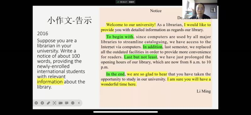 11月3日,伊迎老师开展考研英语作文指导讲座。她从事件、要求和评分细则引入,指出了常见错误,重点强调在语言运用中切忌省略、缩写和口语化。此外,伊迎老师还结合历年考题归纳了小作文的常见考查形式和大作文写作中重要的“描述、寓意、分析、评论”四步法。