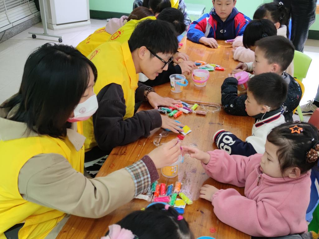 “与‘泥’同乐 ,妙绘春天”手工活动。此环节把知识“融”进了泥里,将真情传递在指尖。在志愿者的帮助下,小朋友们将橡皮泥捏成不同的形状,例如大象、狮子等。其中一位小朋友捏出了耳朵的形状,为纸上的卡通小人补全了五官,收获了大家肯定鼓励的掌声。