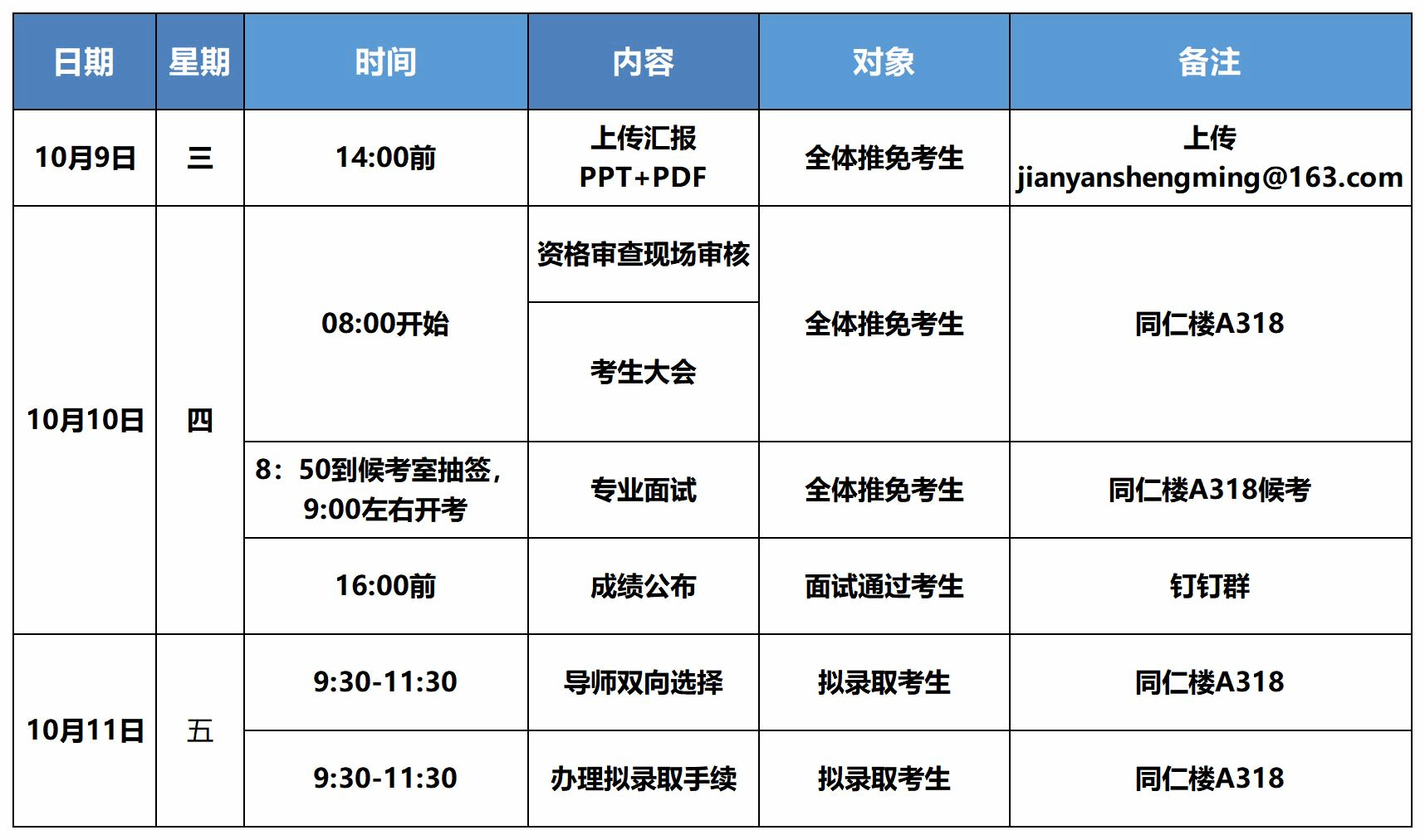 (四)提交个人陈述环节汇报PPT到邮箱[email protected],汇报PPT需同时制作成PDF版本,两者均以报考专业+姓名+考生编号命名,在10月9日14:00前打包发送到[email protected],材料一经发送,不接受修改。PPT具体内容要求详见第四点复试内容。
