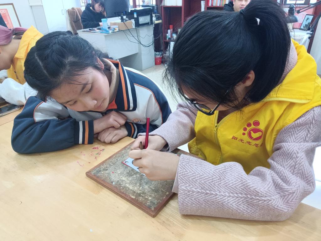 “互学互助,共同成长”社团体验活动。特殊教育学校团委副书记丁姝雯老师带领志愿者们参观了校史馆、各个学生社团,社团活动教室内陈列着学生制作的细纹刻纸、瓯绣、石头画手工艺品,这些作品刻画细致,制作精美,让志愿者们连连惊叹“进城了”。随后,志愿者们与学生共同合作完成了细纹刻纸作品,在欢声笑语中进一步加深感情,共同进步。