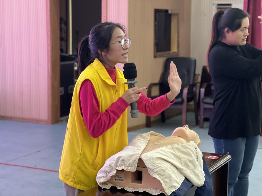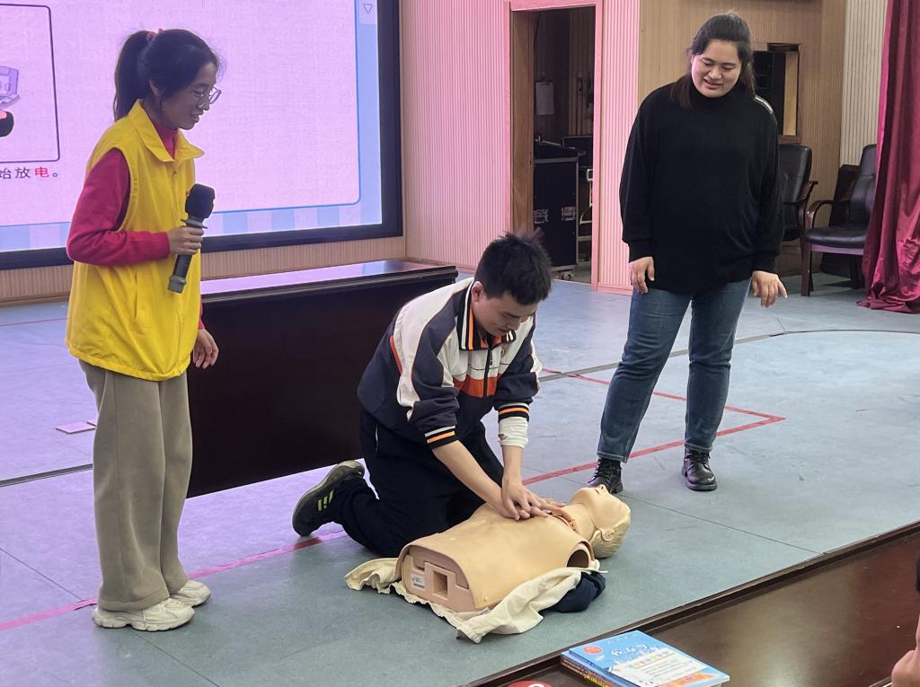 “生命关爱,‘救’现在”小课堂。为了让学校师生感受到服务队对听障儿童的关爱,增强他们的自救、互救能力,金智博老师向特殊教育师生介绍了“益耳密码”生命关爱志愿服务活动的基本内容,志愿服务队长夏婷婷同学讲解并演示了心肺复苏的基本步骤,师生积极参与实操,氛围欢乐融洽。