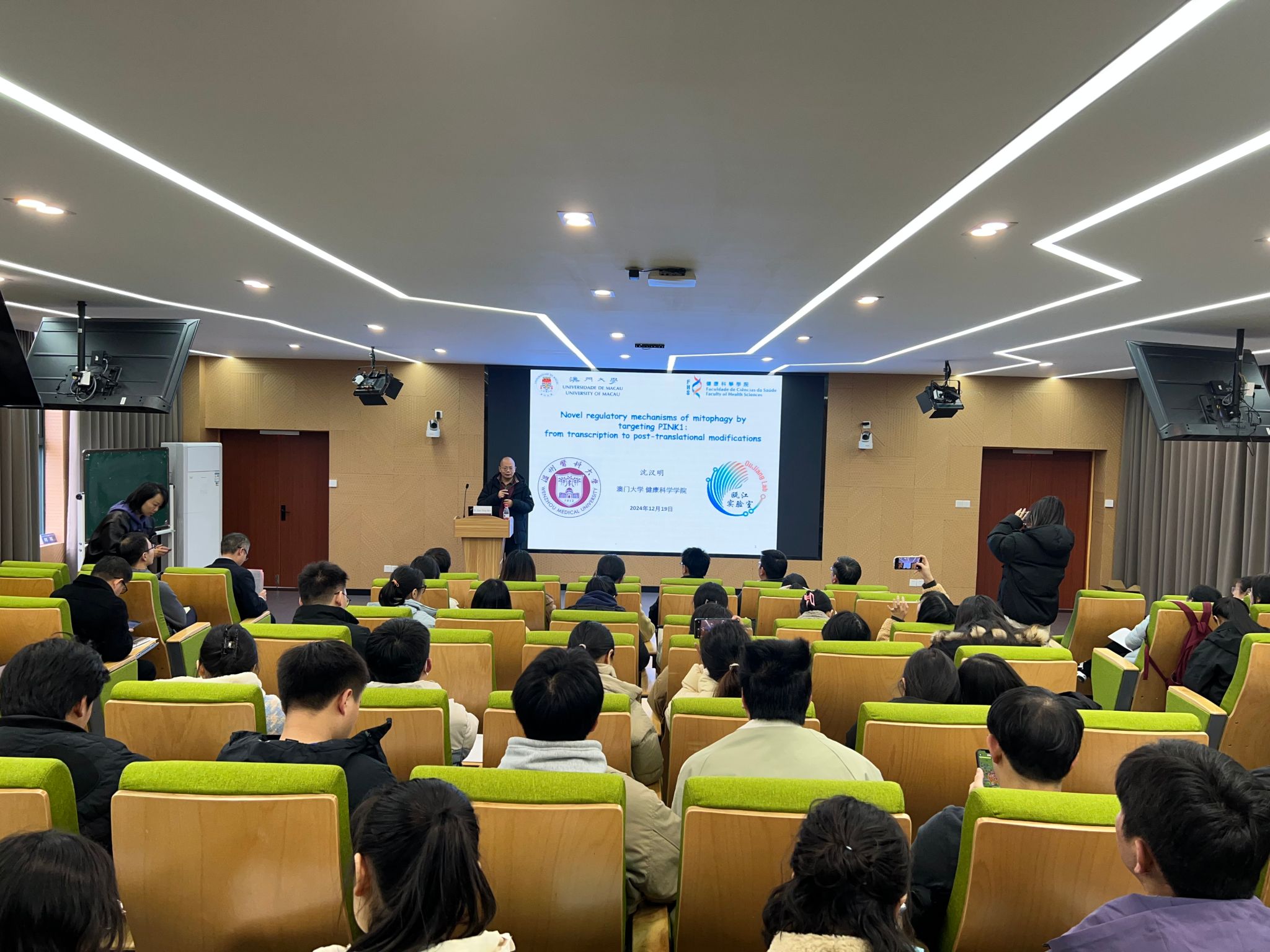 12月19日,澳门大学健康科学学院副院长Hanming Shen教授应邀来51吃瓜网 开展求真讲坛专家讲座,本期讲坛主题为《Novel regulatory mechanisms of mitophagy by targeting PINK1, from transcription to post-translational modifications(靶向PINK1的线粒体自噬新调控机制,从转录到翻译后修饰》,学院院长郑晓群、各学科带头人、青年科研骨干以及研究生代表参加,讲座由学院副院长黄海山主持。
