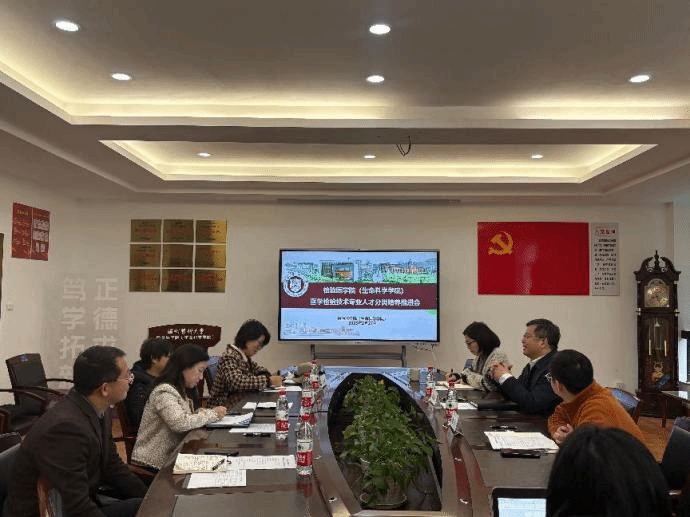 召开医学检验技术专业人才特色培养推进会。会议由院长郑晓群主持,学院副院长谢旦立、医学检验技术专业《医学形态学拓展》 《输血与输血技术》 《生物信息学》《病理学技术》等特色课程负责人及教学办公室相关人员参会。