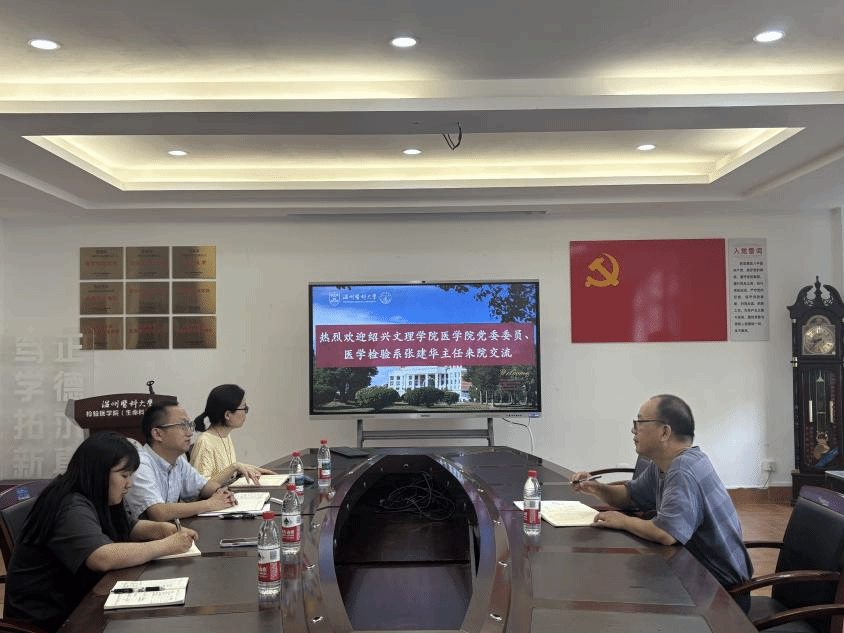 7月2日下午,绍兴文理学院医学院党委委员、医学检验系张建华主任来院交流本科教育教学工作,学院党委委员、副院长谢旦立,教学办主任陈晨、科员杨亭亭、李茹嘉出席了会议。会议由谢旦立副院长主持。